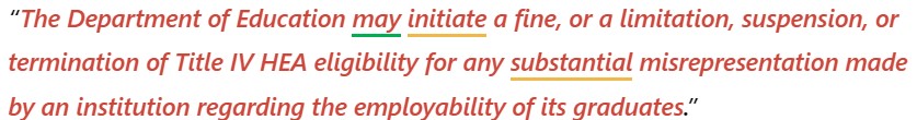 Now, over a decade later, the 2021 Federal Student Aid Handbook states clearly that “the school must provide information on the placement of, and types of employment obtained by, graduates of the school’s degree programs.” Should this information be inaccurate (which includes missing), “The Department of Education may initiate a fine, or a limitation, suspension, or termination of Title IV HEA eligibility for any substantial misrepresentation made by an institution regarding the employability of its graduates.” That gets my attention.
