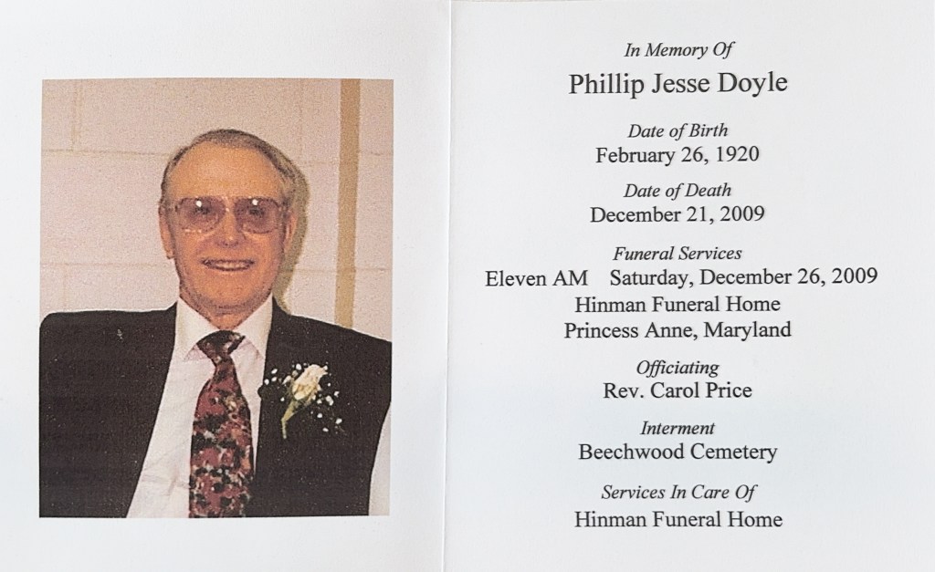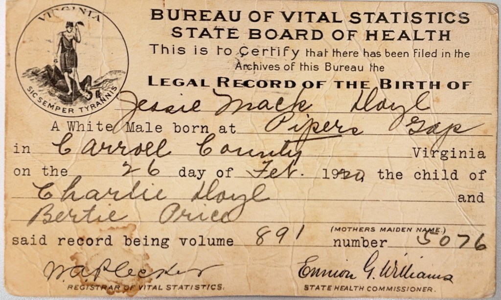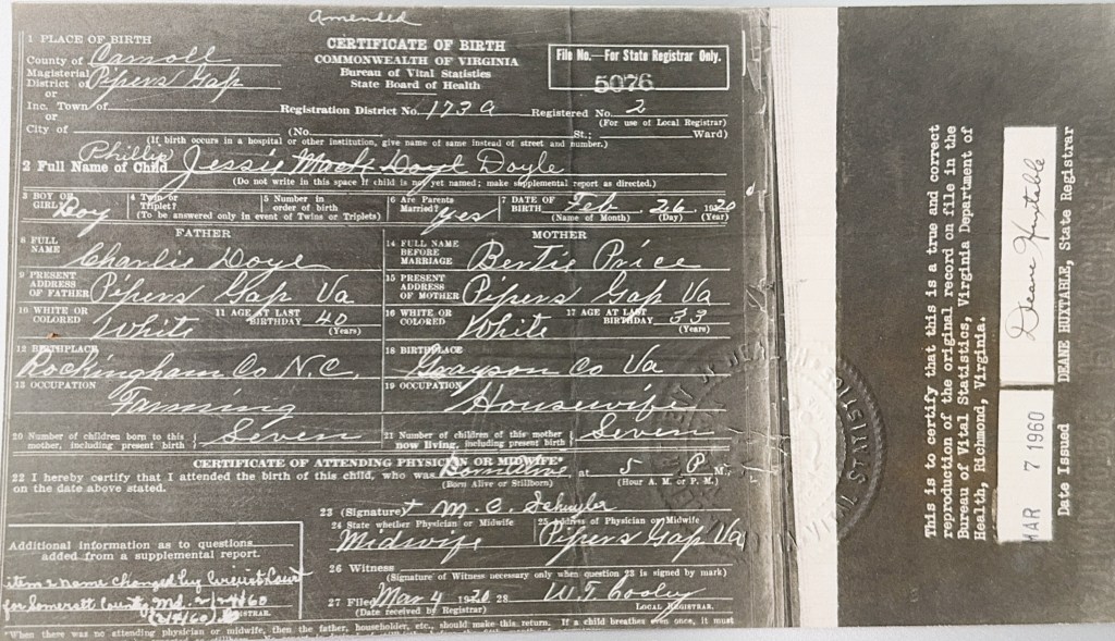 My Doyle Grandparents 06/30/2024Add a comment My Pop-Pop’s 1920 birth certificate My Pop-Pop’s updated 1960 birth certificate Pop-Pop’s parents – Charlie & Bertie May. They had 13 children. He was a farmer. Pop-pop Mom-Mom’s 1922 birth certificate Mom-Mom & friends Home where Pop-Pop and Mom-Mom raised their family. Pop-Pop and 3 of his 12 siblings (Uncle Roy on far right and Uncle Talmadge 2nd from right) Letter in September 1969 to my parents at 4316 Rowalt Dr., College Park, MD Share this: Click to share on X (Opens in new window) X Click to share on Facebook (Opens in new window) Facebook More Click to share on LinkedIn (Opens in new window) LinkedIn Like Loading...