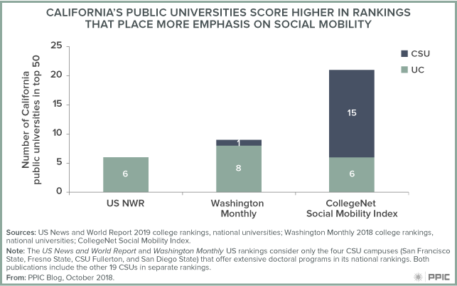 Of the top 20 universities for social mobility, California has the most at 7 (and they have many more in the top 50), New Jersey has 3, and New York, and Florida each have 2 universities. This leaves 1 in D.C., Illinois, North Carolina, Indiana, Georgia, and Texas.