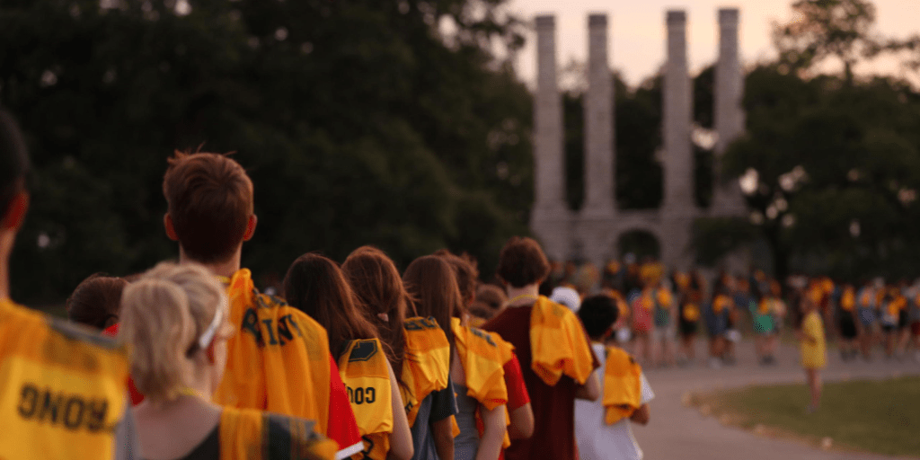 Second, we offered a 5-day, 4-night extended orientation in June and July where we invited only the students and offered them the closest thing we could to a Disneyland experience. This included putting them up in some of our nicest residence halls, bringing in some of the most entertaining faculty, and renting travel buses for a road trip to our original campus, where we served them a Texas BBQ dinner and had them walk silently down a luminaire-lined path at dusk for a special ceremony where they were given, as they walked under the original campus arches, a one-of-kind football jersey with their graduation year and personally selected nickname on the back.