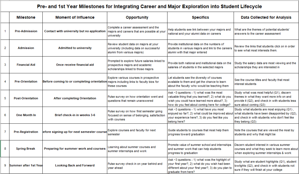 I used my knowledge of the student lifecycle from first contact through the end students’ first year, to build the table below. My hope is that this model serves as a catalyst for any college seeking to nudge students in a positive direction using pivotal moments in their first year of college.