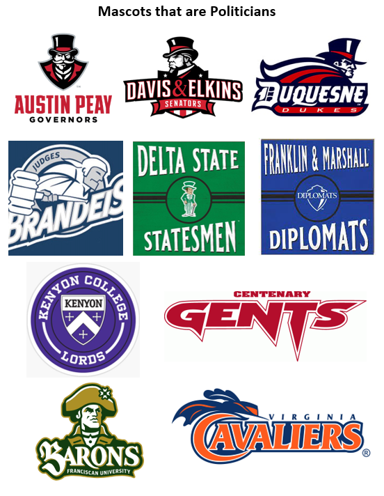 - U. of Virginia Cavaliers (Charlottesville) (Cavaliers were wealthy royalist supporters of King Charles I during the English Civil War)