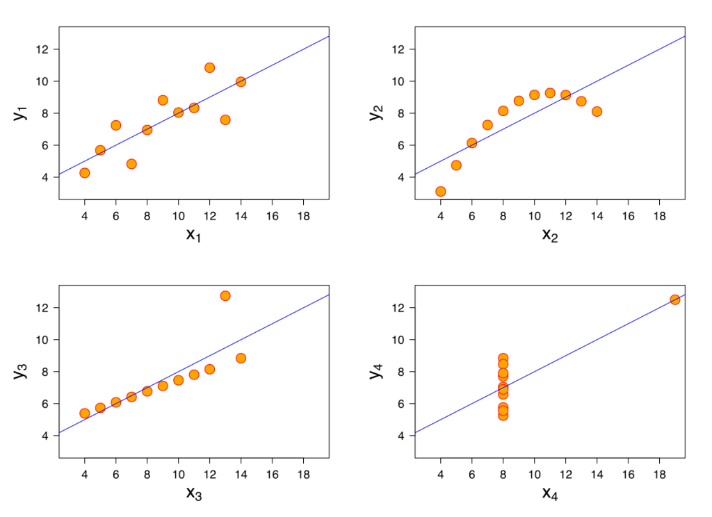 Anscombe’s Quartet: Four sets of numbers that look identical on paper (mean average, variance, correlation, etc.) but look completely different when graphed. Describes a situation where exact calculations don’t offer a good representation of how the world works.
