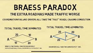 Braess’s Paradox: Adding more roads can make traffic worse because new shortcuts become popular and overcrowded.