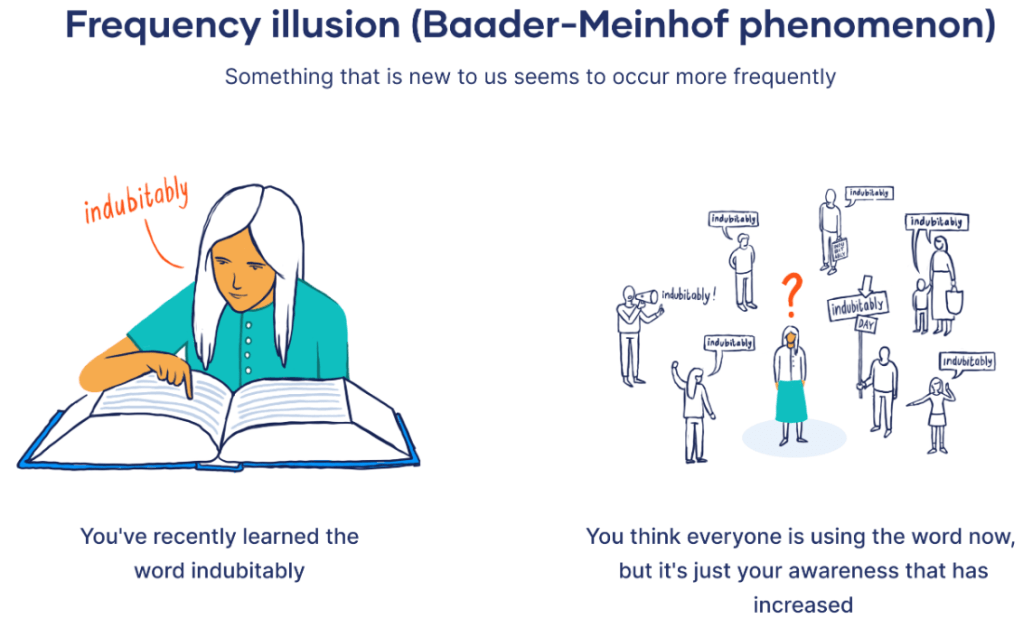 Baader-Meinhof Phenomenon: Noticing an idea everywhere you look as soon as it’s brought to your attention in a way that makes you overestimate its prevalence.